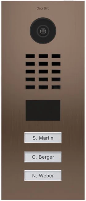The DoorBird D2103BV is a Flush-mounted IP Video door intercom with brushed Stainless steel bronze finish housing and three illuminated nameplate call buttons. The DoorBird D2103BV delivers sharp HDTV 720p live video at a 110° viewing angle and detailed night vision. The DoorBird connects via wired Ethernet via an included dongle. The free DoorBird app works with Android and iOS.