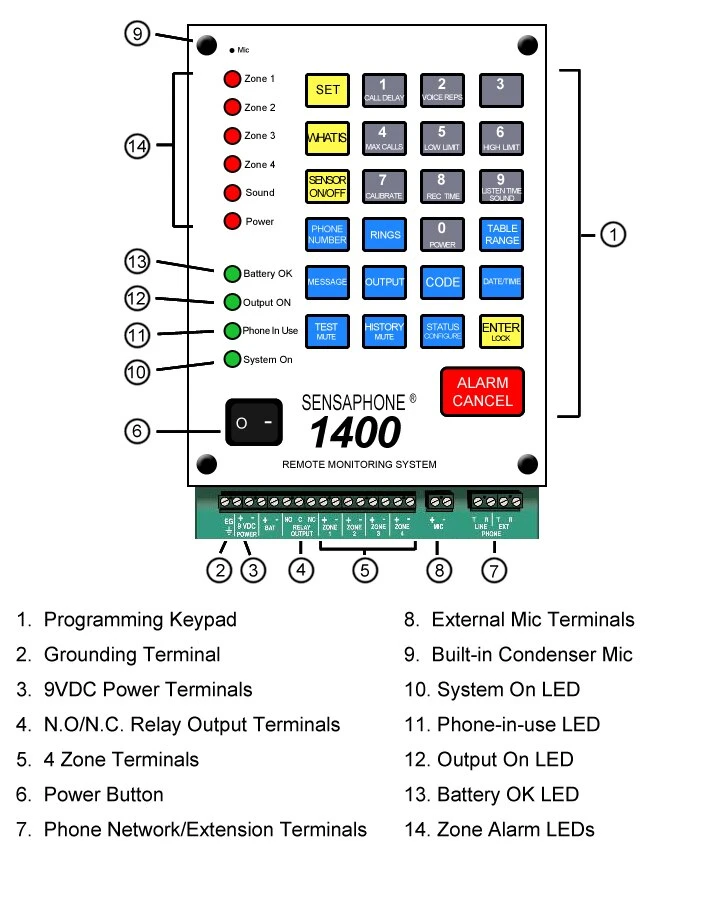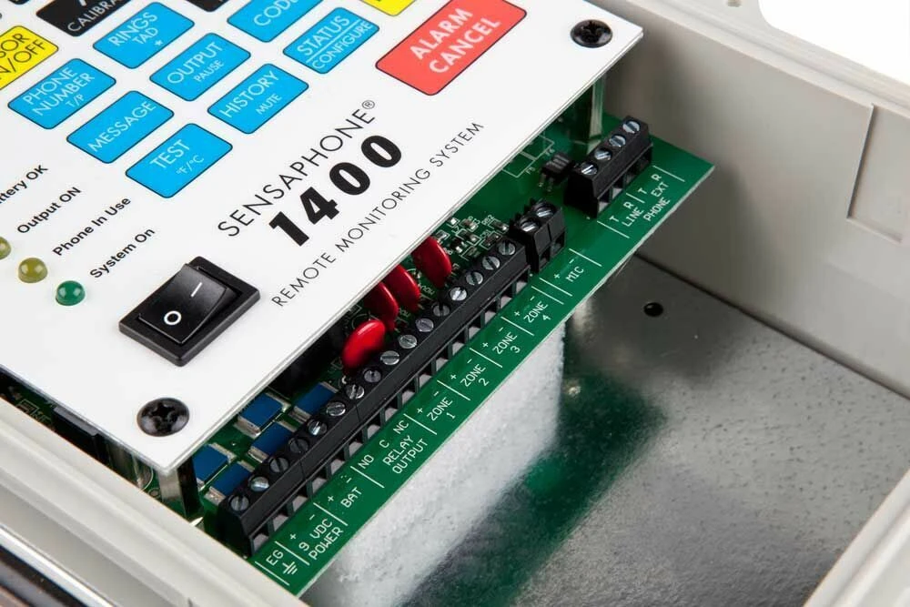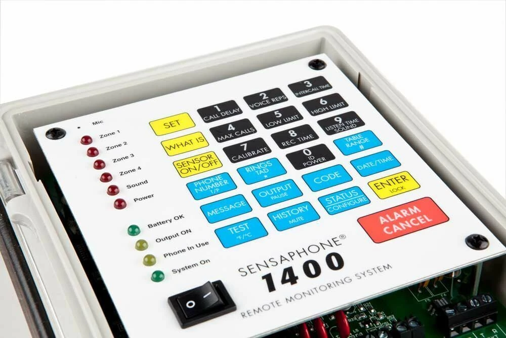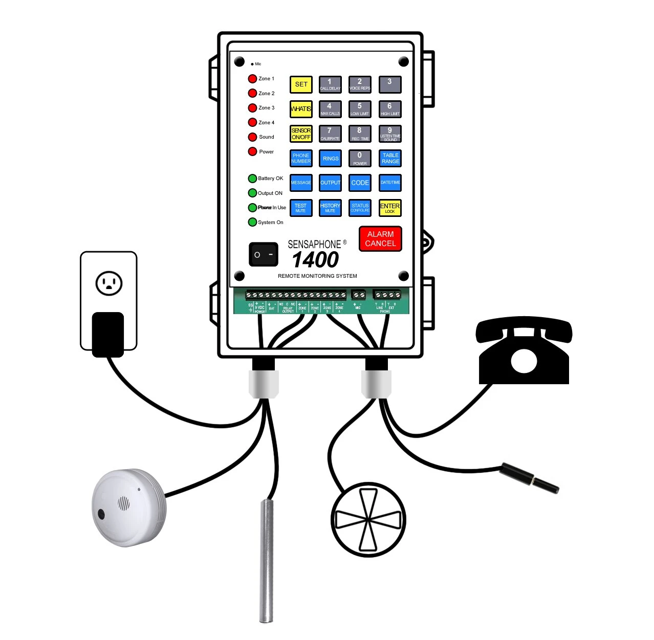 The Sensaphone 1400 is a 4 zone alarm and auto dialer that is accessible from anywhere in the world via the telephone. The 1400 is capable of providing users with real-time status and phone alerts from up to 4 wired sensors. It also provides power failure monitoring.